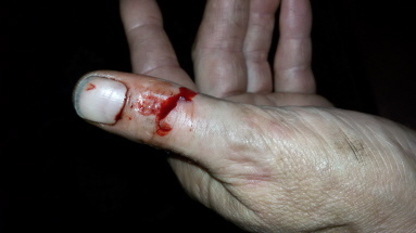 So sah der Daumen am Samstagabend aus. Die Verletzung bekam ich gegen 15Uhr (keine Selbstversuch).